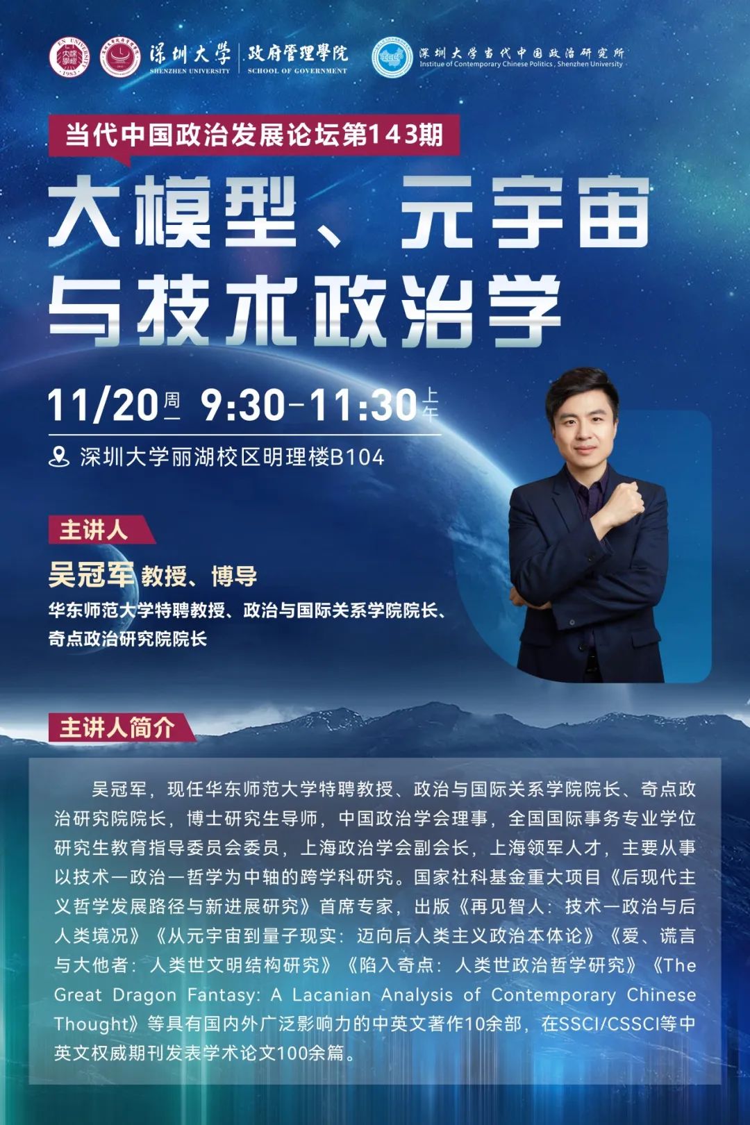 吴冠军,现任华东师范大学特聘教授、政治与国际关系学院院长、奇点政治研究院院长,博士研究生导师,教育部特聘教授,中国政治学会理事,全国国际事务专业学位研究生教育指导委员会委员,上海政治学会副会长,上海领军人才,主要从事以技术—政治—哲学为中轴的跨学科研究。国家社科基金重大项目《后现代主义哲学发展路径与新进展研究》首席专家,出版《再见智人:技术—政治与后人类境况》《从元宇宙到量子现实:迈向后人类主义政治本体论》《爱、谎言与大他者:人类世文明结构研究》《陷入奇点:人类世政治哲学研究》《The Great Dragon Fantasy: A Lacanian Analysis of Contemporary Chinese Thought》等具有国内外广泛影响力的中英文著作10余部,在SSCI/CSSCI等中英文权威期刊发表学术论文100余篇。
