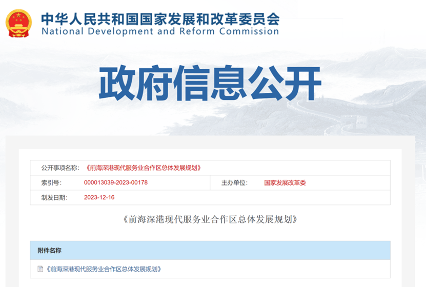 2023年12月10日,国务院正式批复原则同意《前海深港现代服务业合作区总体发展规划(送审稿)》(国函〔2023〕144号),支持前海打造粤港澳大湾区全面深化改革创新试验平台,建设高水平对外开放门户枢纽,在深化深港合作、支持香港经济社会发展、高水平参与国际合作方面发挥更大作用。