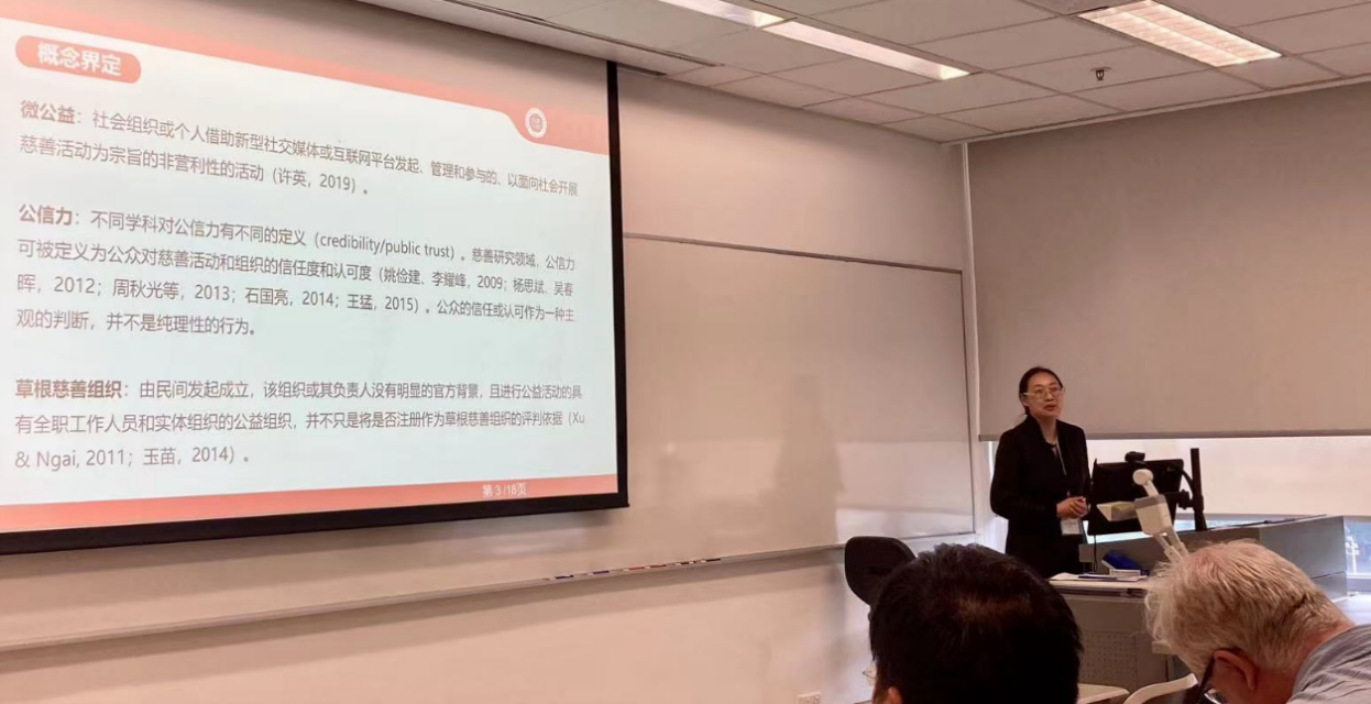 许英教授报告的题目是《草根慈善組織與微公益籌款的公信力——以 “騰訊99公益日”為例》。许教授指出,“腾讯99公益日”不仅是国内最早利用互联网平台推动微公益捐款的经典代表;还为推进中国互联网公益的发展,不断完善参与规则,进行了不少创新。2023年的“99公益日”公众筹款超38亿,参与用户超过1.2亿人。然而,在取得显著成绩的同时,公益筹款领域诈捐、骗捐、套捐等失范行为频发,严重影响了微公益的公信力。在报告中,许教授对“腾讯99公益日”参与规则进行了系统梳理;并在文献回顾的基础上,提出初步的理论框架;进而以“腾讯99公益日”为例,通过质化方法对4个草根组织进行实证研究,从制度信任、组织信任和职位信任三个维度,讨论并分析了草根慈善组织在参与微公益筹款中出现的套捐、参与率下降、能力建设不足等典型问题,并提出了相应的对策建议。