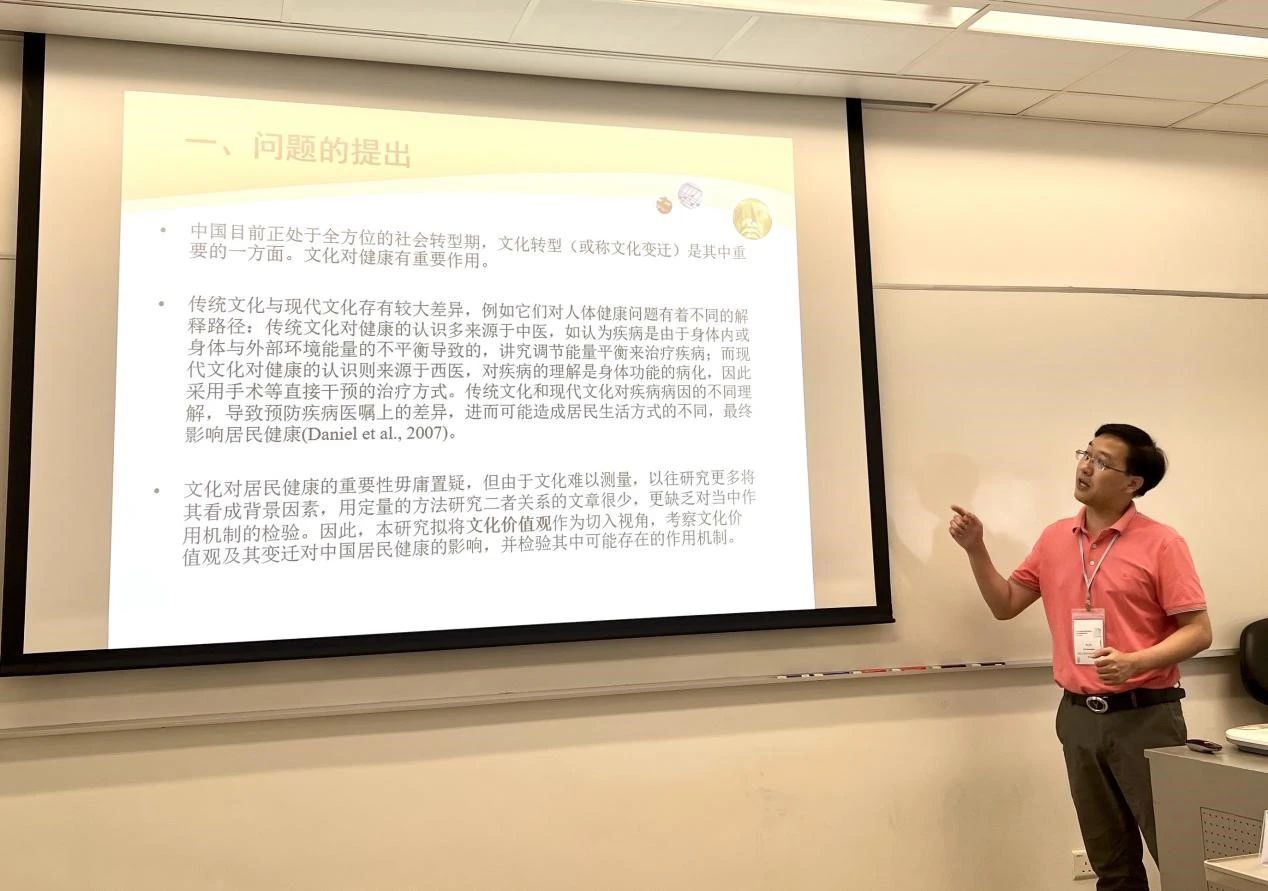 池上新副教授做了题为《Cultural Values, Lifestyle and Health of Chinese Residents: An Analysis Based on WVS2007‐2012》学术报告。池教授指出,以往国内学界对文化与健康二者关系的实证研究较少,更缺乏当中作用机制的检验。利用世界价值观调查的中国数据,他探讨了文化价值观与中国居民健康的关系及其作用机制。研究发现:一、中国居民文化价值观中传统成分仍多于现代成分,但由传统向现代的转型趋势明显。二、不同文化价值观维度对中国居民健康有着重要的差异效应:开放主义、集体主义价值观可以促进居民健康;相反,保守主义价值观不利于居民健康,个体主义价值观对居民健康没有统计上的显著性。可见,探讨文化价值观与中国居民健康二者的关系,不能简单地作“传统——现代”二元区分,应考察各自的具体维度。三、运动参与等积极生活方式是文化价值观(主要是开放主义价值观)影响中国居民健康的中介变量。因此,在文化转型背景下,提高中国居民健康水平,既要采纳更加开放式的现代文化要义,也要弘扬优秀的传统文化精神,还须提倡积极的生活方式。