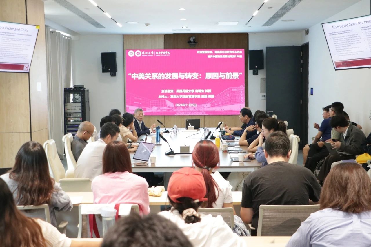 2024年11月6日上午,由深圳大学政府管理学院、当代中国政治研究所和深圳大学港澳基本法研究中心联合举办的“当代中国政治发展论坛”第150期讲座在守正楼B201会议室顺利举行。此次讲座邀请到了美国丹佛大学约瑟夫·科贝尔国际关系学院教授兼美中合作中心主任赵穗生主讲“中美关系的发展与转变:原因和前景”。讲座由政府管理学院唐娟教授主持,学院院长俞可平教授、港澳基本法研究中心主任邹平学教授出席,全院40余名师生参加。