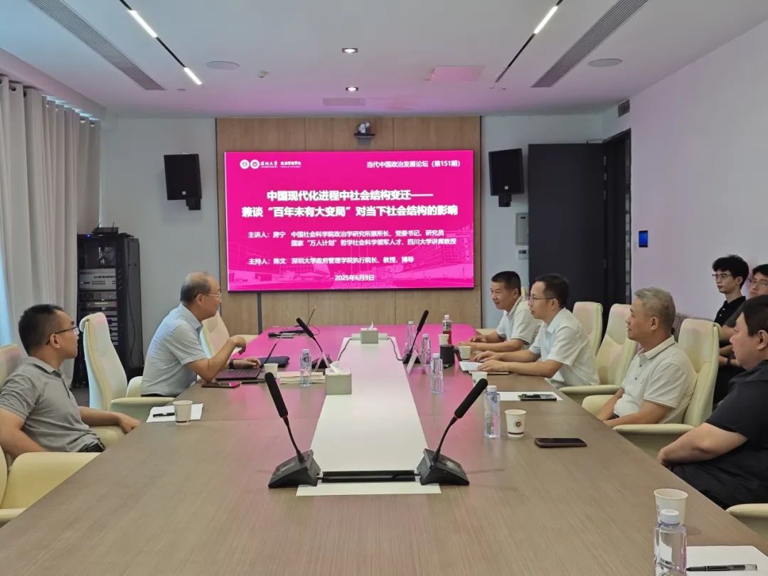 2025年6月9日,中国社会科学院政治学研究所原所长、党委书记、研究员,四川大学讲席教授房宁受邀到访我院,以“中国现代化进程中社会结构变迁——兼谈‘百年未有之大变局’对当下社会结构的影响”为题作讲座分享。讲座由深圳大学政府管理学院执行院长陈文教授主持,深圳市南山区民政局一级调研员唐奕,深圳大学中国经济特区研究中心全国干部教育培训基地钟向阳,学院政治学系副主任陈科霖、副研究员冯秀成及学院师生参加。