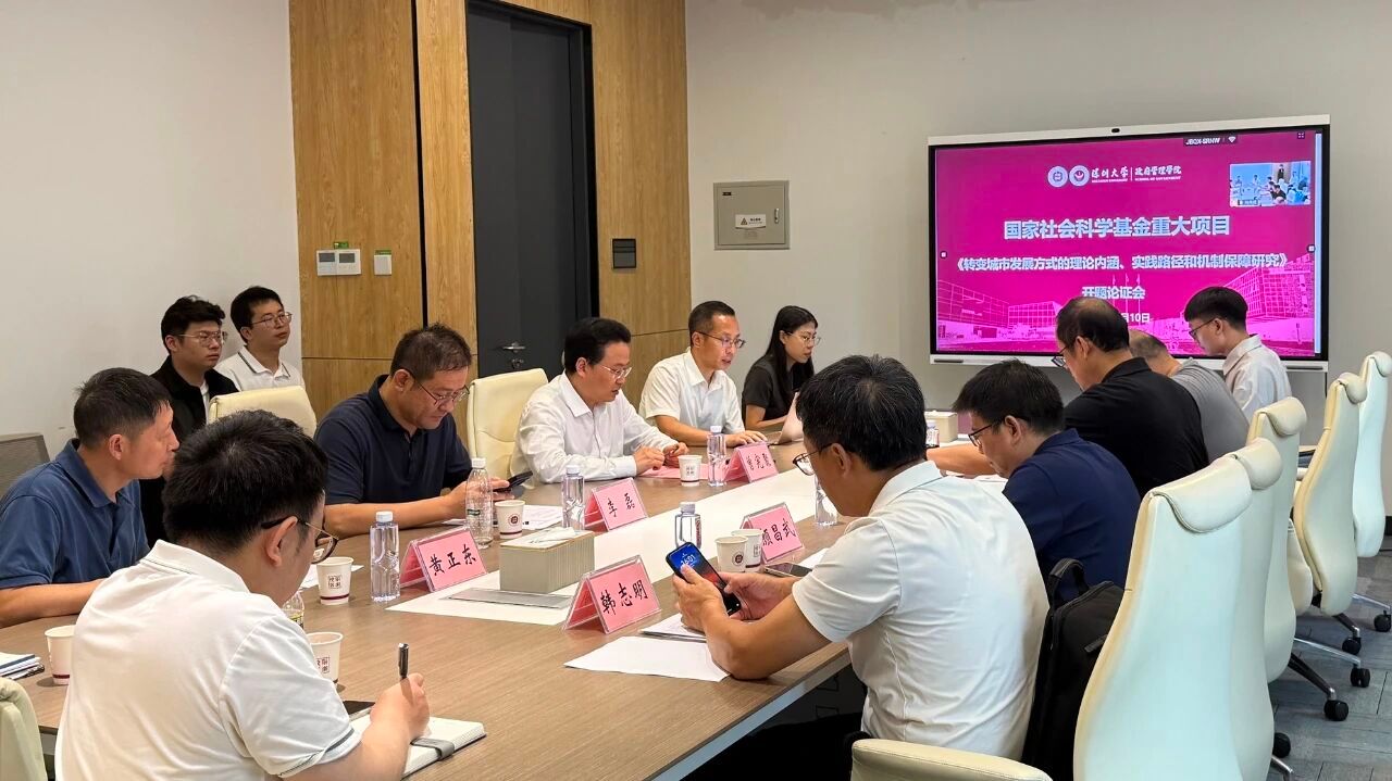 2025年10月10日下午,国家社会科学基金重大项目“转变城市发展方式的理论内涵、实践路径和机制保障研究”开题论证会在深圳大学丽湖校区守正楼B203会议室顺利举行。本次会议邀请了来自北京大学、复旦大学、上海交通大学、天津大学、东北大学和暨南大学等高校的多位知名专家组成评议组。专家组成员包括曹海军教授、韩志明教授、陆军教授、李磊教授、彭勃教授、唐亚林教授和颜昌武教授,会议推选彭勃教授任专家组组长。该项目由深圳大学政府管理学院执行院长陈文教授担任首席专家,课题组子课题负责人韩福国教授、黄正东教授出席会议;深圳大学社会科学部主任曾宪聚教授主持开题论证会。