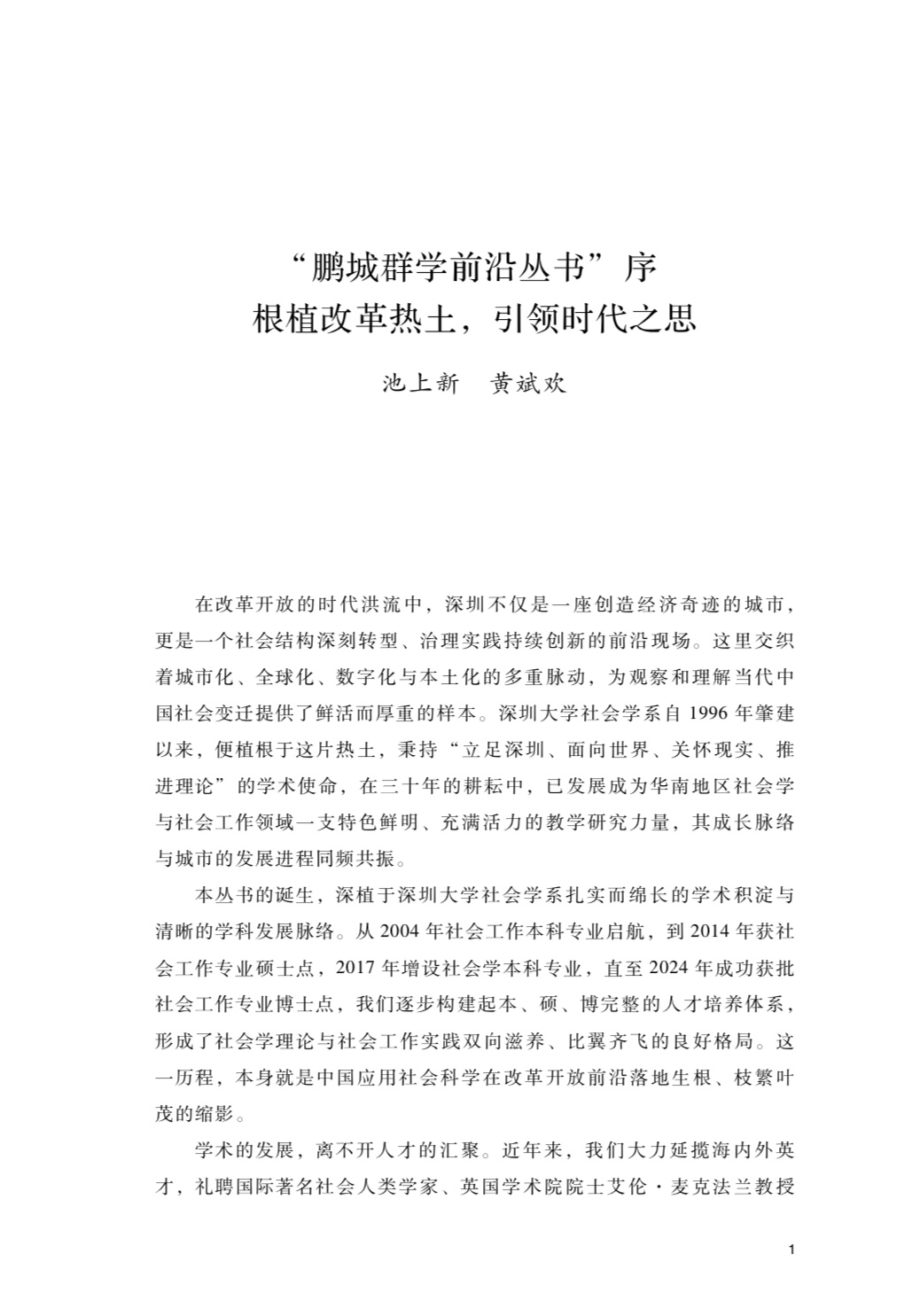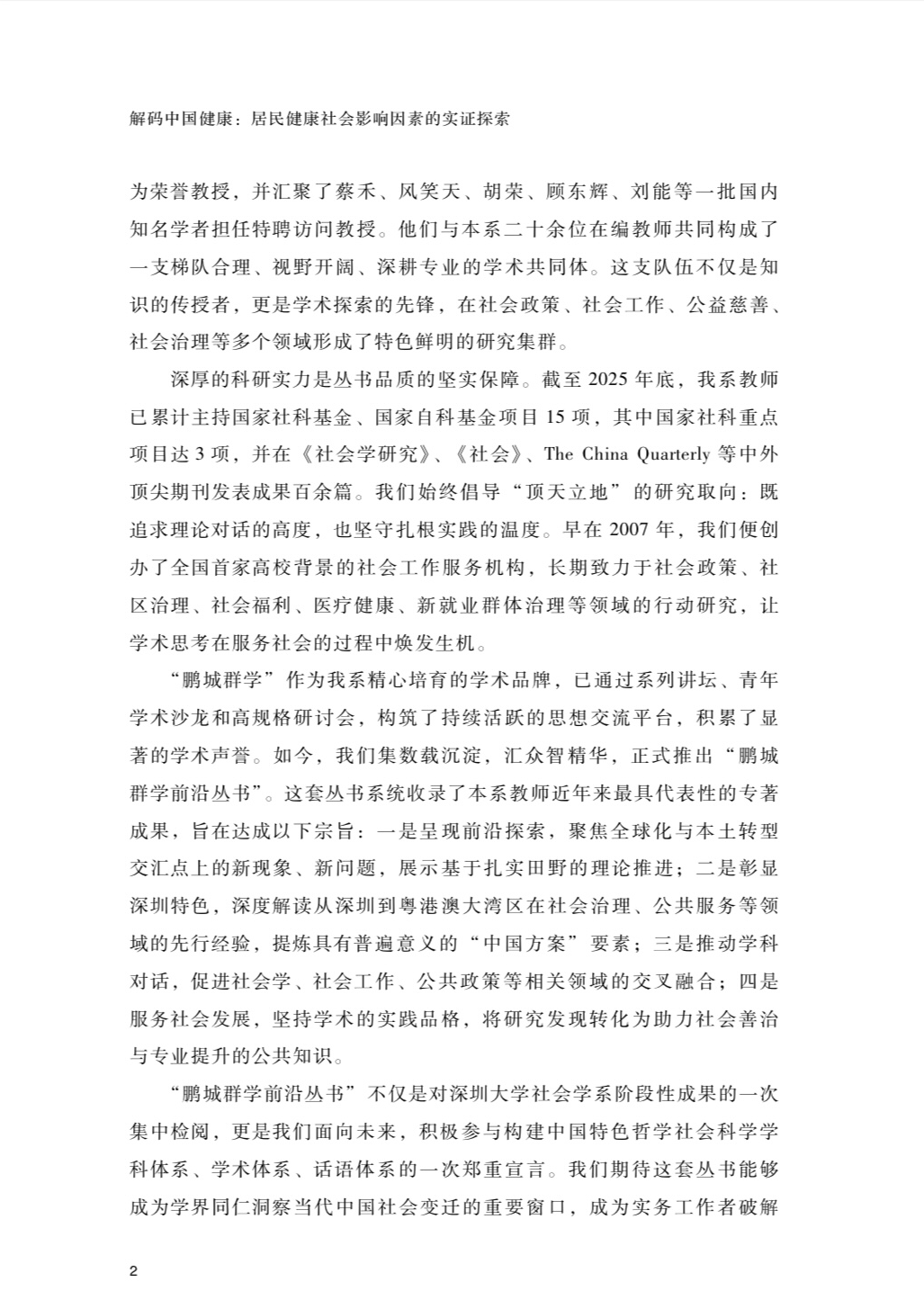 “鹏城群学前沿丛书”不仅是对深圳大学社会学系阶段性成果的一次集中检阅,更是我们面向未来,积极参与构建中国特色哲学社会科学学科体系、学术体系、话语体系的一次郑重宣言。我们期待这套丛书能够成为学界同仁洞察当代中国社会变迁的重要窗口,成为实务工作者破解治理难题的有益参考,成为所有关心中国社会现代化进程读者的思想资源。