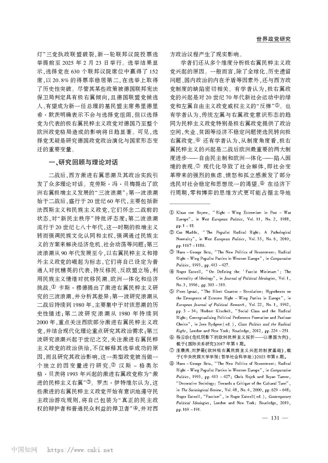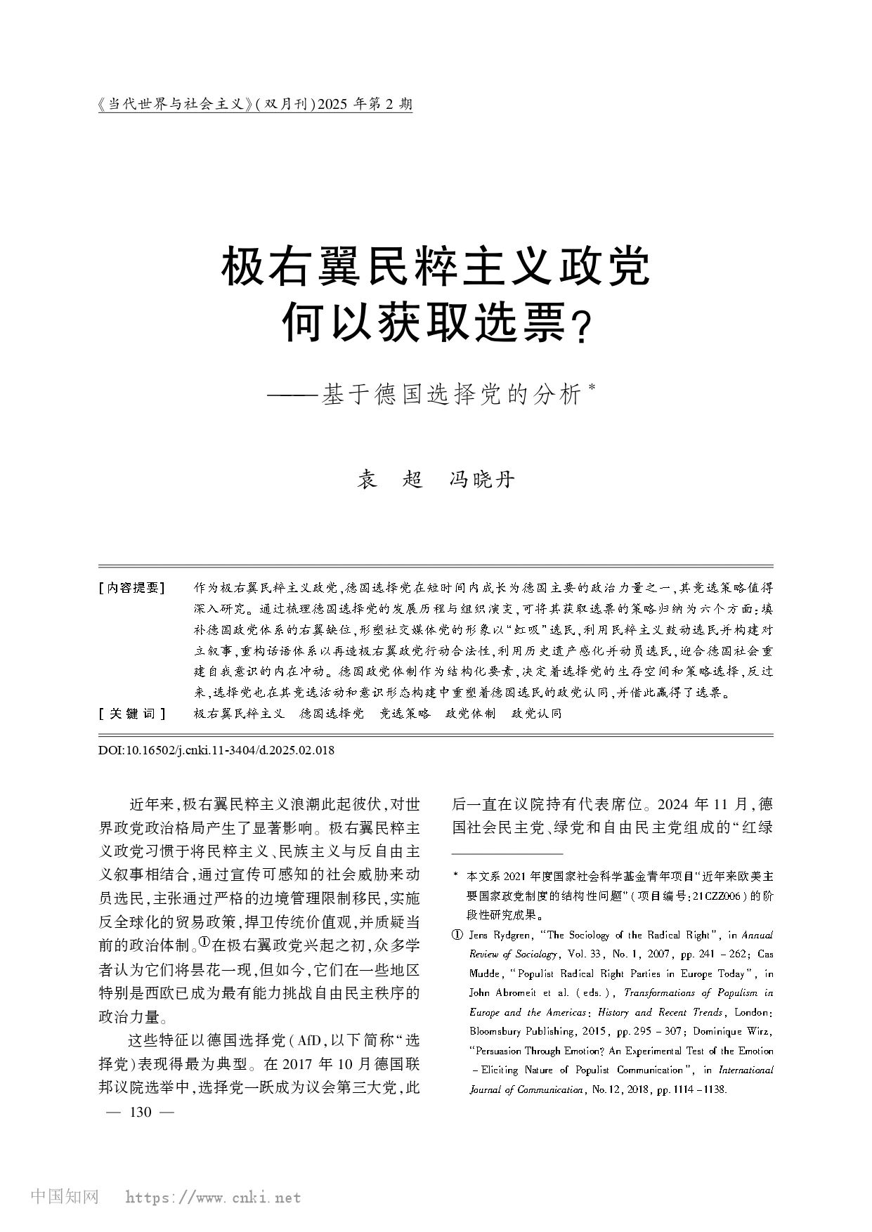 文章来源:袁超,冯晓丹.极右翼民粹主义政党何以获取选票?——基于德国选择党的分析[J].当代世界与社会主义,2025,(02):130-139.