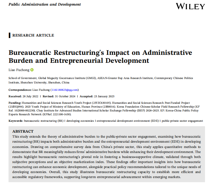 近日,我院廖福崇助理教授撰写的研究论文“Bureaucratic Restructuring's Impact on Administrative Burden and Entrepreneurial Development”在Public Administration and Development在线发表。廖福崇是论文独立作者,深圳大学是唯一署名单位。该论文发现中国政府改革有效降低了行政负担,为企业发展提供了良好环境,推进了经济高质量发展。论文以中国政府卓有成效的行政改革研究对象,丰富了行政负担理论,强调中国政府改革的成功经验可以对其他发展中经济体提供参考借鉴。Public Administration and Development(PAD),国际标准刊号0271-2075,创刊于1949年,由WILEY出版发行,主要关注公共管理与发展研究的相关议题,被SSCI数据库收录,是公共管理(Public Administration)和发展研究(Development Studies)类别的专业刊物,5年周期影响因子为2.5,2024年最新JCR分区为SSCI Q2区。