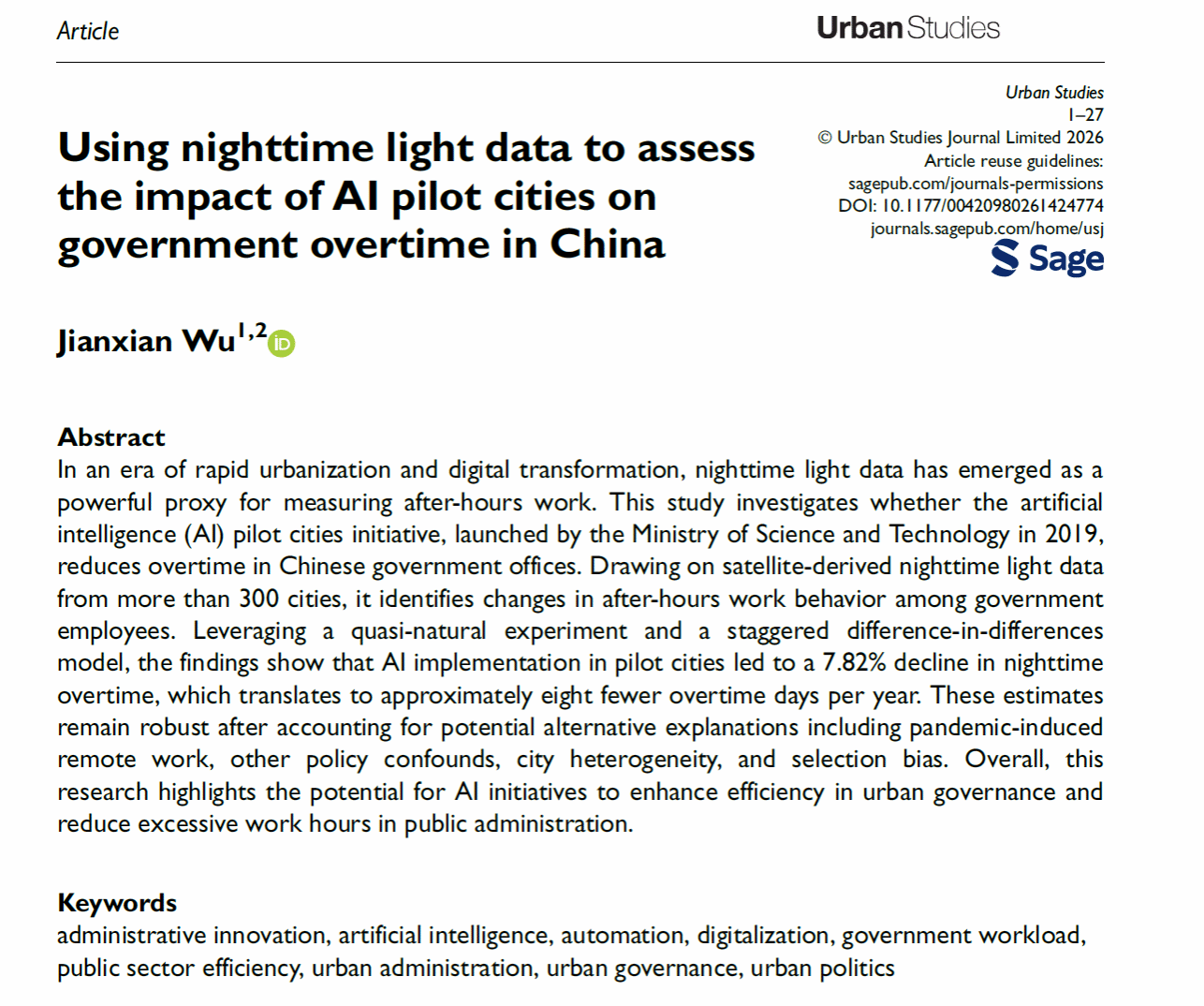 近日,我院博士后吴健贤独立撰写的研究论文“Using nighttime light data to assess the impact of Al pilot cities on government overtime in China”在国际城市研究顶刊 Urban Studies在线发表,深圳大学为唯一署名单位。