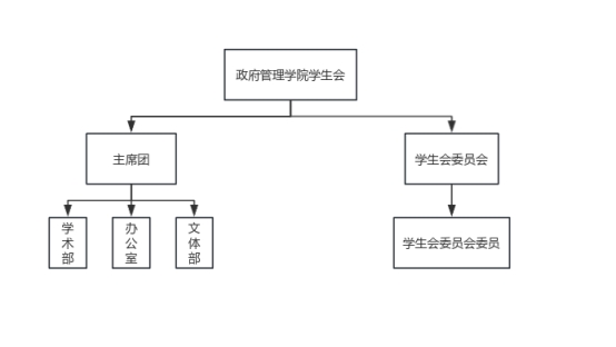 政府管理学院学生会设有主席团及学生会委员会。其中,学生会委员会由学生会委员会委员组成;主席团下设三个部门,分别为办公室、学术部和文体部。