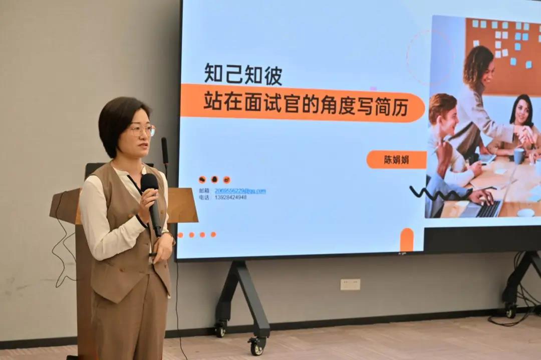 第二位分享的嘉宾陈娟娟,毕业于深圳大学行政管理专业,她创立早晨酒店管理公司和大悦文化传媒公司,拥有多年从事猎头顾问及行政人事管理工作的经验。陈娟娟导师在简历撰写方面提出了具体建议。她指出,写简历的重点并不是“我做了什么”,求职者应具有“他方思维”,明白面试官想看什么。陈娟娟导师也提到,简历与岗位的匹配程度是面试官考量的第一要素,并强调了个人特色和发展潜力也是面试官考虑的重要部分。她的讲解深入浅出,让在场学生对简历撰写有了全新的认识。
