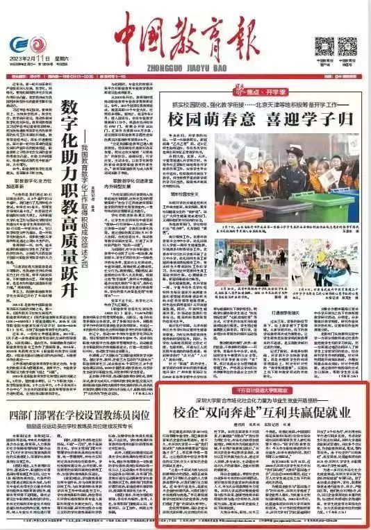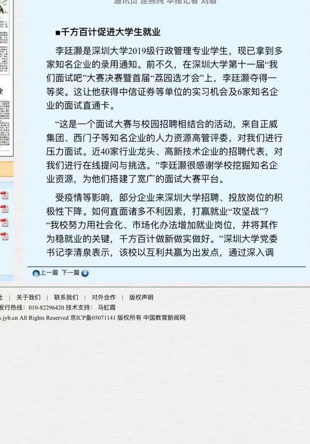 关于获奖的感受主要有三点。第一是自豪,因为比赛分为技术赛道、职能赛道、市场赛道三大赛道。我作为一名行管的学生,参加职能赛道也许更具有优势,但还是我选择了接触较少的市场赛道,并获得了一等奖,我觉得这对我自己来说是一种挑战,也是一种突破。为什么能够成功?我认为这其中有一个关键的破局点,也是我当时的一个思考,就是你要去找到自己的优势,而不是被你本身所在的领域所局限。第二是喜悦,能够作为深大的学生代表,更是政府管理学院和公共管理系的代表,登上《中国教育报》的头版。感觉自己仿佛解锁了人生的新成就,也是一种荣誉的象征。第三是感谢,感谢我们的学院专业的培养以及我们深大给我们提供的平台。不仅搭建了就业平台,同时通过专业的比赛机制,实现应聘者和企业的“双向选择”,我觉得这是一种模式的创新,建议学弟学妹们都可以去利用好这样的一个资源。