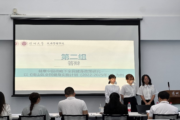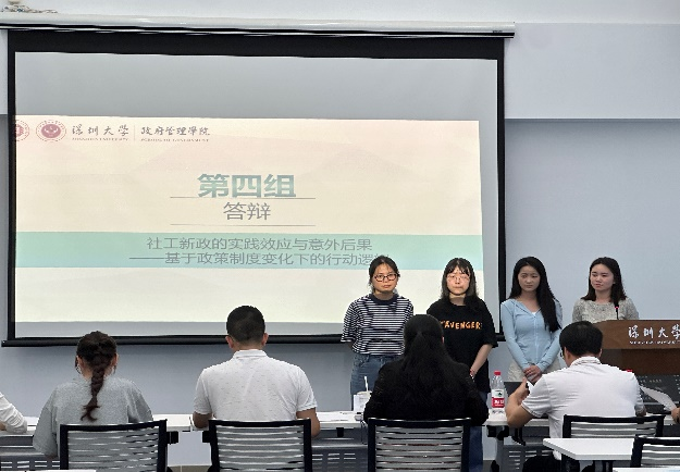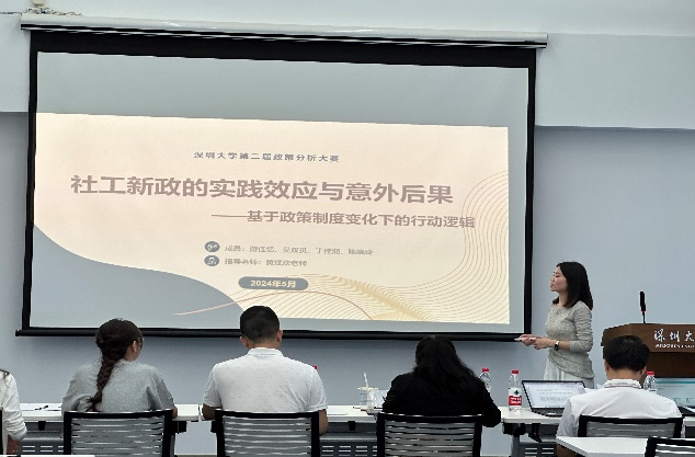 决赛于5月26日下午举行,评委由深圳大学政府管理学院副院长、社会学系主任黄斌欢老师、公共管理系副教授耿旭老师、社会学系副主任徐拓倩老师和学院辅导员、副教授黄锐波老师出席颁奖典礼。5支队伍围绕中国特色社会主义高等教育、社工新政、健康中国战略、深圳市人才政策、深圳市乡村统租政策等当下社会热点以及前沿政策,进行生动展示以及深入分析,并结合前期调研经验回答了四位评委提出的问题;评委们也根据各队伍的项目成果给出了一针见血的指导性点评、分析和建议。