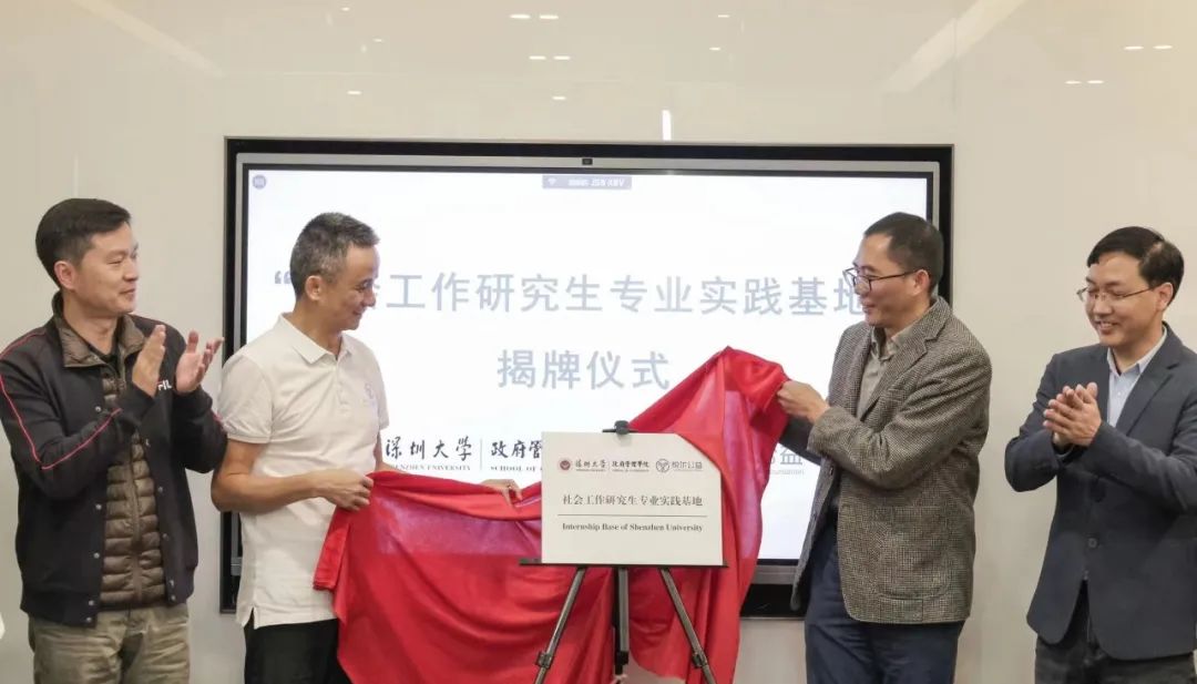 深圳大学政府管理学院党委副书记张国强,社会工作教育中心主任唐咏教授,社会学系主任池上新副教授、许英教授与悦尔公益理事长兼秘书长吕宗恕、理事陶伟、公益研究部负责人刘嘉茵、高级研究员陈姗、综合办公室高级行政经理赵倩艺,共同为专业实习基地揭牌,我院多位社会工作专业硕士研究生见证了这一时刻,揭牌仪式结束后,师生共同实地参观了悦尔公益深圳办公室。