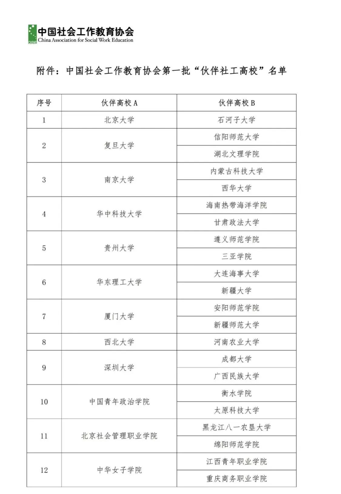 为促进社会工作专业教育的高质量发展,推动不同高校之间的交流合作,中国社会工作教育协会开展“伙伴社工高校”计划,深圳大学于2024年成功入选第一批名单,与广西民族大学和成都大学分别结成“伙伴社工高校”。