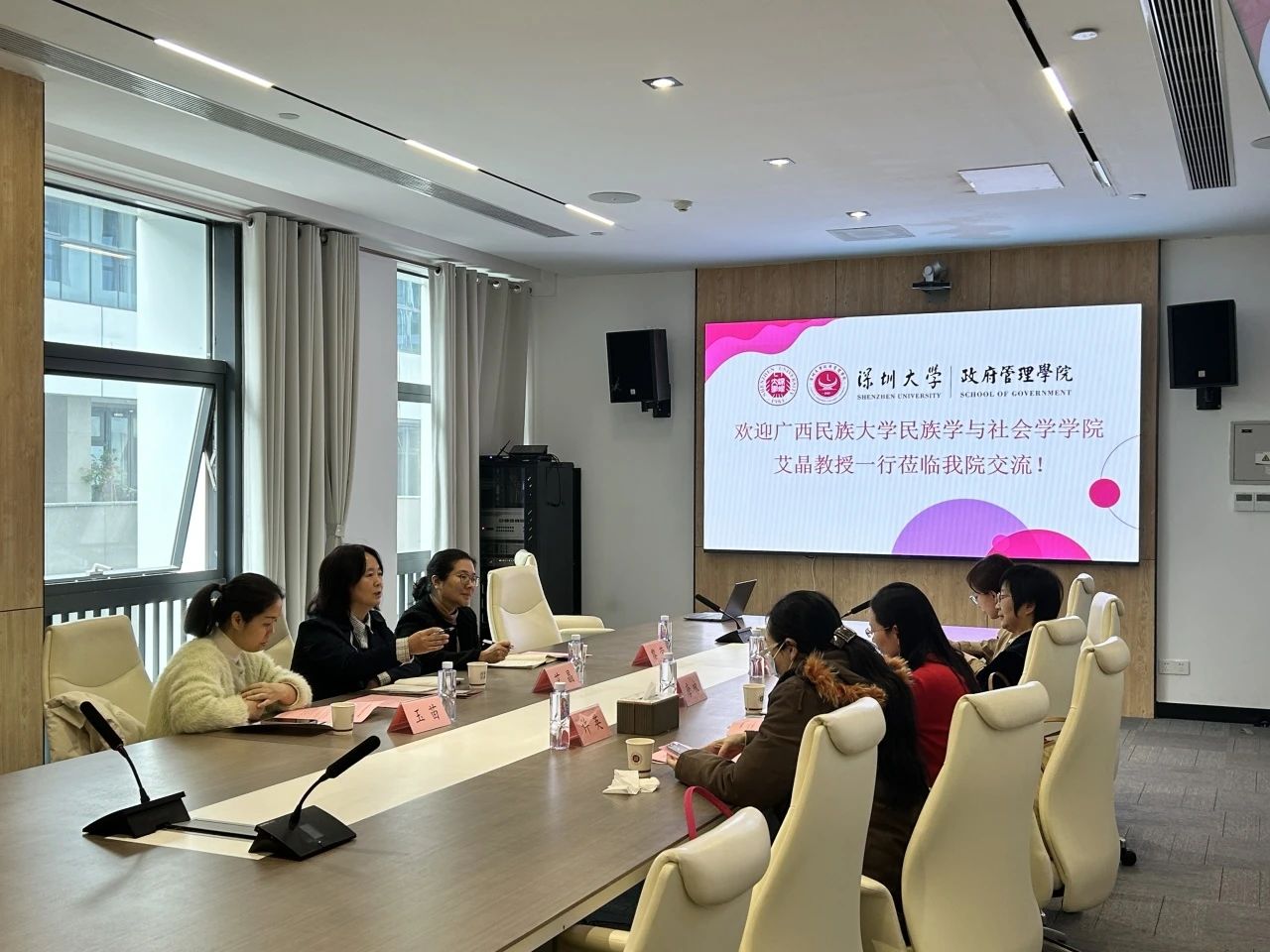 2024年12月25日,广西民族大学民族学与社会学学院艾晶教授、社会学系党支部书记黎莹副教授和社会工作专业硕士学位授权点负责人玉苗副教授一行三人与深圳大学政府管理学院李晓凤教授、唐咏教授、许英教授和李冰玉副教授就社会工作专业学科建设、服务实践、课程思政、科研与社会服务等情况进行了深入交流和沟通。