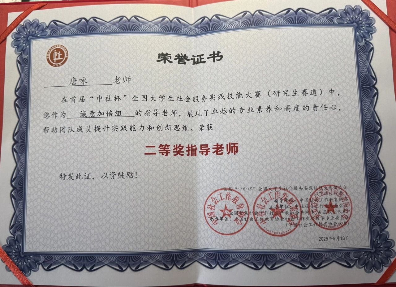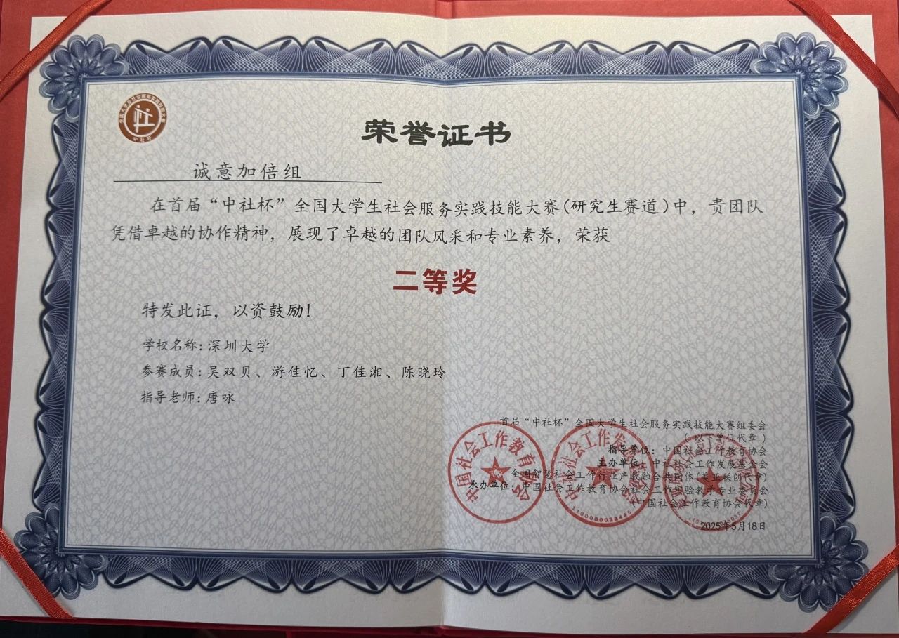 2025年5月18日,由中国社会工作教育协会指导,中社社会工作发展基金会和全国智慧社会工作行业产教融合共同体主办的首届“中社杯”全国大学生社会服务实践技能大赛圆满落幕。本次大赛共有来自复旦大学、中国人民大学、上海大学等263所院校,共763支团队3659名学子报名参赛。深圳大学政府管理学院MSW研究生团队在唐咏教授指导下,荣获研究生赛道全国二等奖,成绩优异。