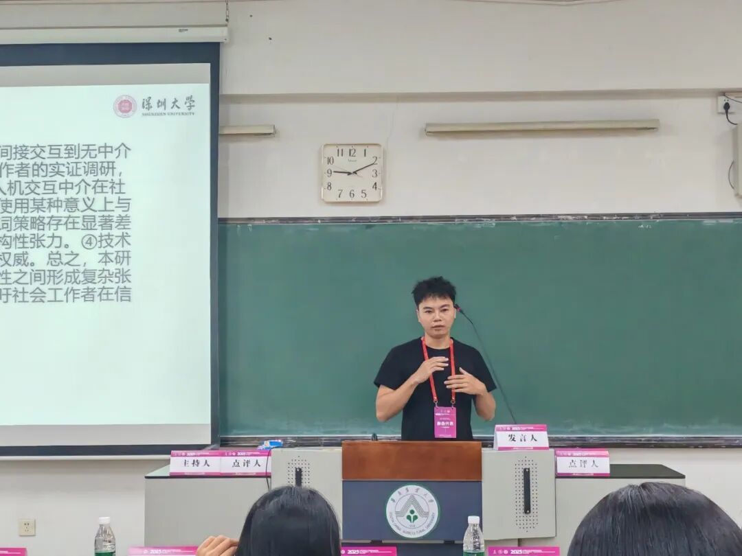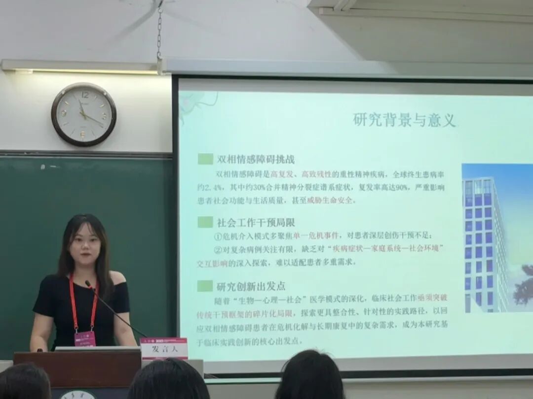 硕士研究生周怡彬和刘滨源在“社会心理服务与临床社会工作”分论坛汇报了《从自杀边缘到助人者:“危机+EPS”双介入模式下的精神障碍患者的个案研究》,研究通过整合“危机介入”与“EPS介入”模式,陪伴服务对象度过三次自杀危机,实现“高危风险可控、家庭沟通转型、创伤经验转化”,为复杂精神障碍创伤干预提供递进式范本。