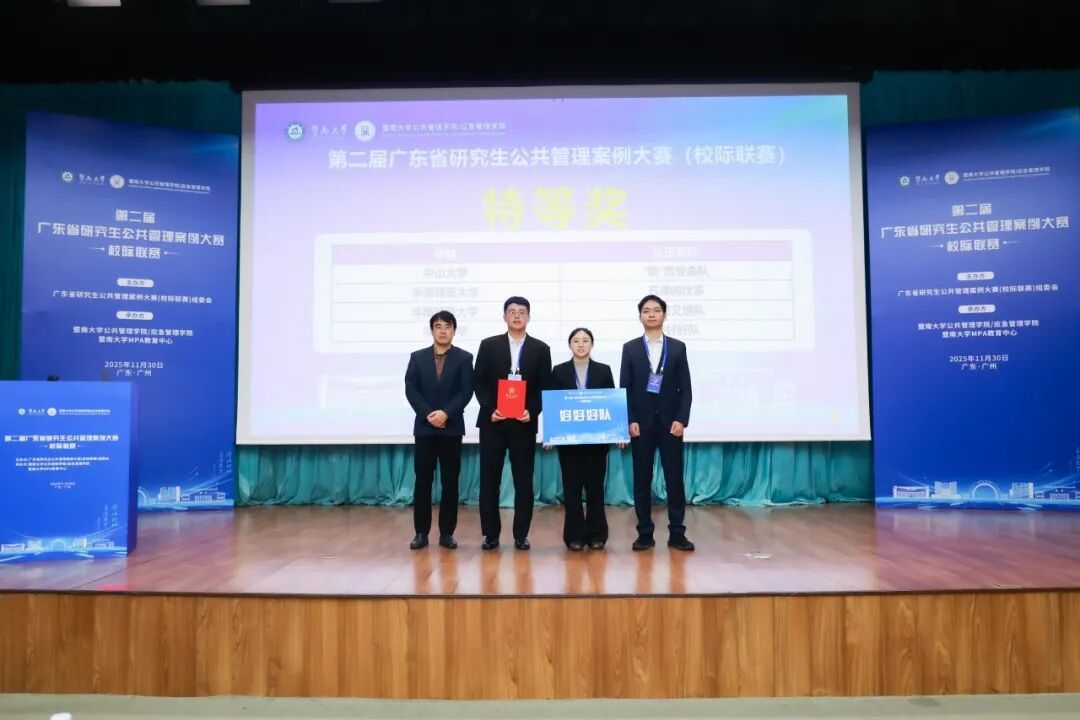 经过严格的初赛文本评审和决赛现场论辩,“好好好队”凭借扎实的专业素养、创新的案例分析和出色的答辩表现,一路过关斩将,最终斩获特等奖,展现了我院师生的优秀学术能力和实战水平。该队伍高梁老师指导,队员包括4位MPA学生劳政雄、陈缘、骆瑗、马弘和1位公共管理学术型硕士研究生秦晓东。