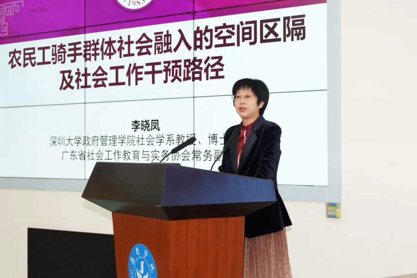 在大会主论坛的主题演讲环节,李晓凤教授发表了题为《农民工骑手群体社会融入的空间区隔及社会工作干预路径》的学术演讲。李教授聚焦于数字化生存背景下新业态劳动者权益,深刻剖析了农民工骑手面临的空间区隔困境,并提出了可操作性的社会工作干预框架。同时,李教授紧扣“百千万工程”中关于新就业群体关怀的痛点与难点问题,以兼具理论深度与现实关怀的视角提出了“问题回应”的实务策略,得到了与会学者的共鸣。