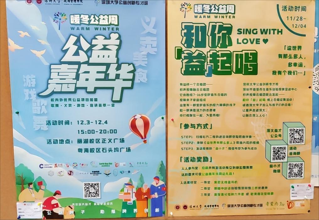 “暖冬公益周”是深圳大学公益慈善校园文化建设品牌活动,由深圳大学公益创新专才班发起,自2020年以来已连续举办三届。2023年暖冬公益周活动将在深圳市民政局指导下,由深圳大学主办,联动全校多个学院及社团,全市三十余家公益慈善组织共同参与活动。