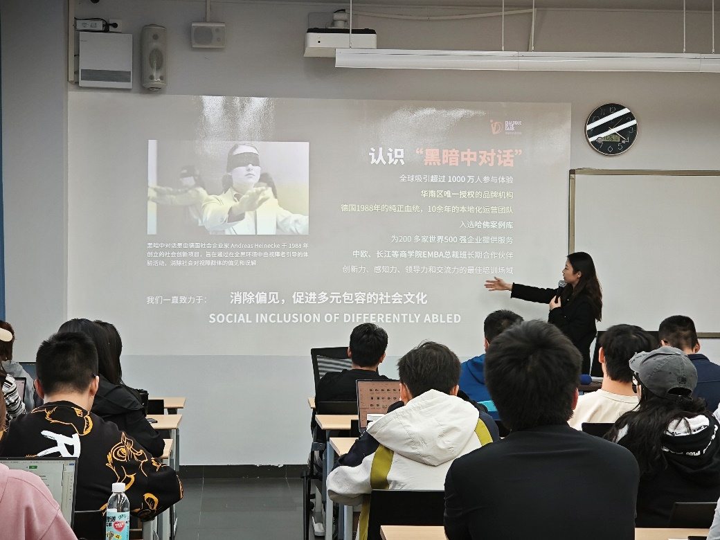 为了让同学们更深入了解“黑暗中对话”的发展历程和运作模式,11月26日“黑暗中对话”深圳馆股东、深圳大学2006级人力资源管理专业校友黄晓莹,亲临深圳大学丽湖校区,为社会创业课程的同学们带来了一场特别的分享交流。
