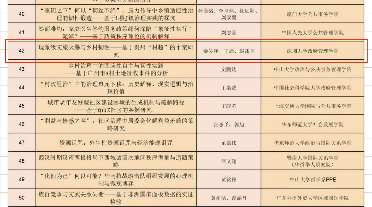 2025年6月18日,第五届中国政治学本科生学术研讨会公布入选名单,团队秦昊洋、王通、赵蓬舟的学术论文《现象级文旅火爆与乡村韧性——基于贵州“村超”的个案研究》成功入选,并作为中央财政支持地方高校改革发展专项资金项目“圳通畅,源自真好洋本科生创新团队建设”的研究成果。