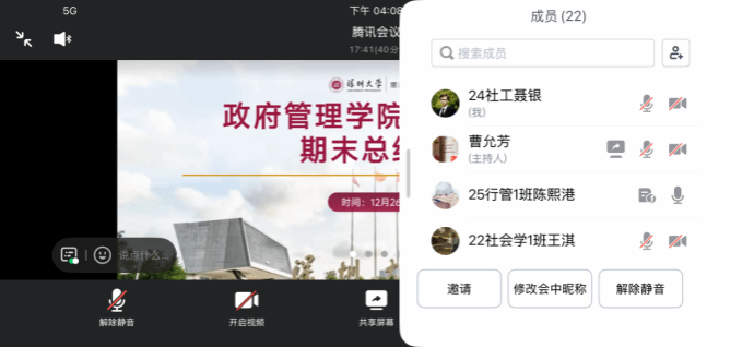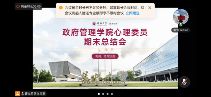 12月26日下午,政府管理学院心理委员期末工作总结通过腾讯会议线上形式召开。本次会议旨在回顾总结本学期的心理委员工作,交流分享大家开展班级心理服务过程中的实践经验,并对后续工作进行规划与动员。学院分管心理工作辅导员黄芳老师、班级心理委员共同参与了本次会议。