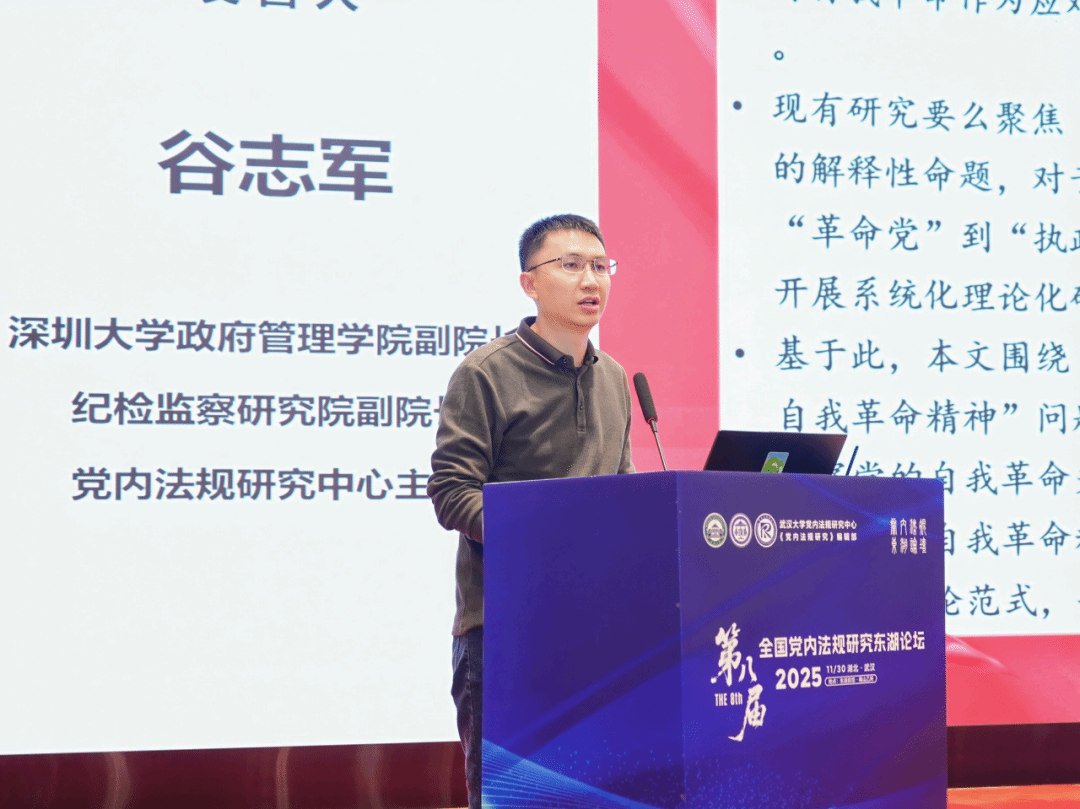 深圳大学政府管理学院副院长、党内法规研究中心主任谷志军教授、林蓉蓉副教授以及博士后曾林妙、硕士生丘嘉沁参会。谷志军教授和林蓉蓉副教授在分论坛主题发言环节分别作了题为“中国共产党保持自我革命精神的调试策略研究”和“国外政党法规制定的外部驱动机制”的报告,两篇论文均被评为“第八届全国党内法规研究东湖论坛优秀论文”。