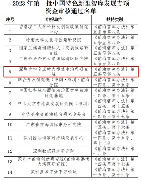 近日,深圳市前海管理局公布了2023年第一批中国特色新型智库发展专项资金审核结果,深圳大学全球特大型城市治理研究院成功入选,获中国特色新型智库发展专项资金资助。