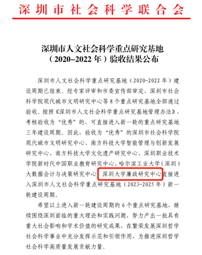 近日,深圳市人文社会科学重点研究基地(2020-2022年)验收结果公布,经专家评审和市委宣传部审定,廉政研究院(深圳大学廉政研究中心)在考核验收中获得“优秀”,直接进入深圳市人文社会科学重点研究基地 (2023-2025年)新一轮建设周期。