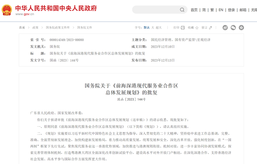 2023年12月10日,国务院正式批复原则同意《前海深港现代服务业合作区总体发展规划(送审稿)》(国函〔2023〕144号),支持前海打造粤港澳大湾区全面深化改革创新试验平台,建设高水平对外开放门户枢纽,在深化深港合作、支持香港经济社会发展、高水平参与国际合作方面发挥更大作用。