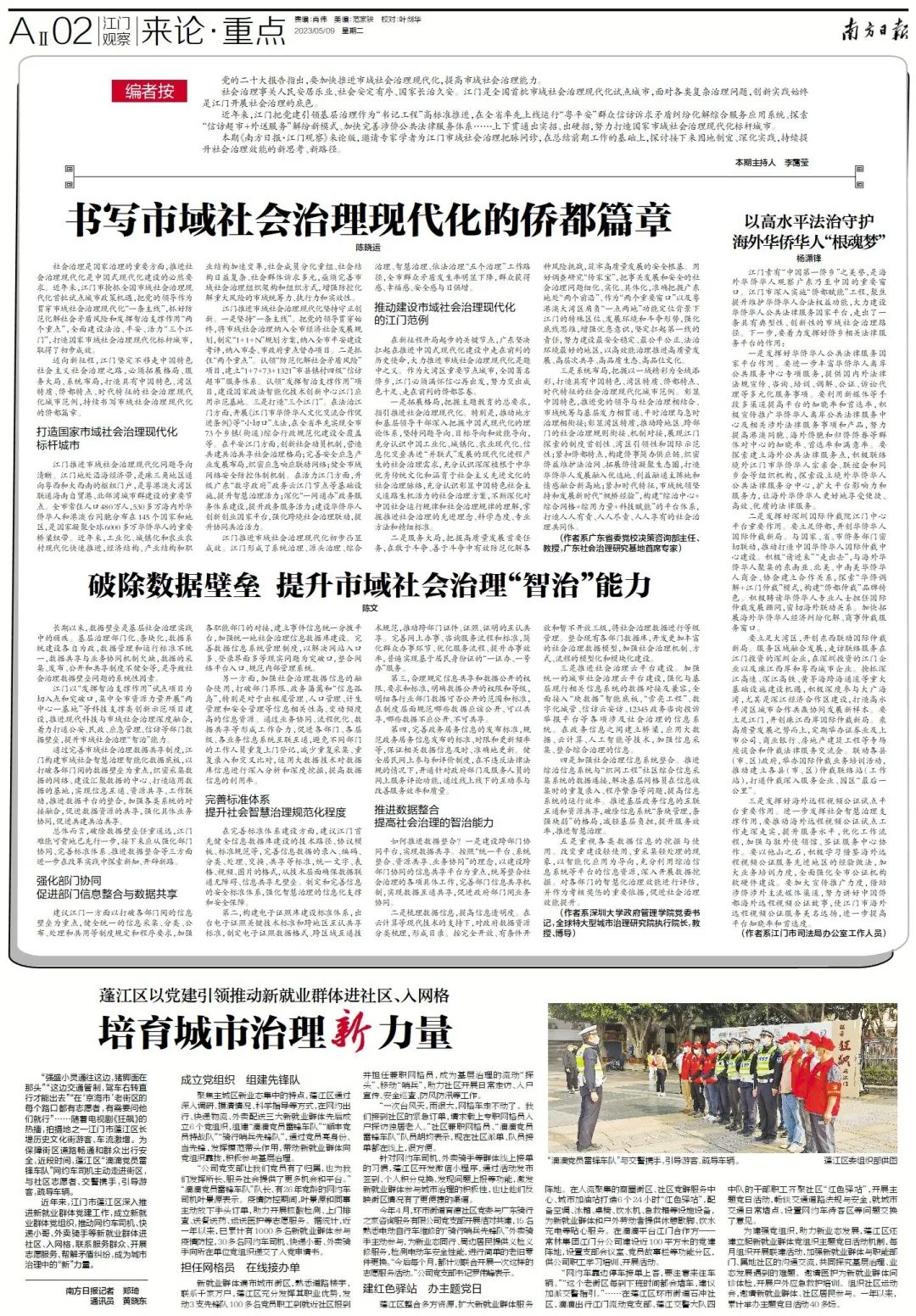 通过完善市域社会治理数据共享制度,江门构建市域社会智慧治理智能化数据底板,以打破各部门间的数据壁垒为重点,织密采集数据的网络、建设汇聚数据的中心、打造运用数据的基地,实现信息互通、资源共享、工作联动,推进数据平台的整合,加强各类系统的对接融合,促进数据资源的共享,强化具体业务协同,促进共建共治共享。