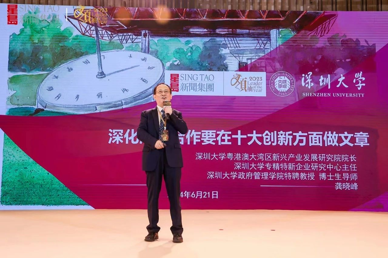 在大会会场,深圳大学政府管理学院特聘教授、博士生导师、深圳大学粤港澳大湾区新兴产业发展研究院创院院长龚晓峰教授发表了关于深化深港合作创新举措的主题演讲。