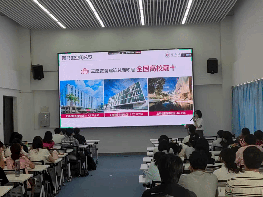 深圳大学图书馆老师向同学们对图书馆资源进行了详细介绍,包括图书馆服务概览、电子资源导航、文献检索技巧,向同学们展示了如何访问电子书籍、期刊和数据库,如何利用图书馆资源进行有效的学术研究。