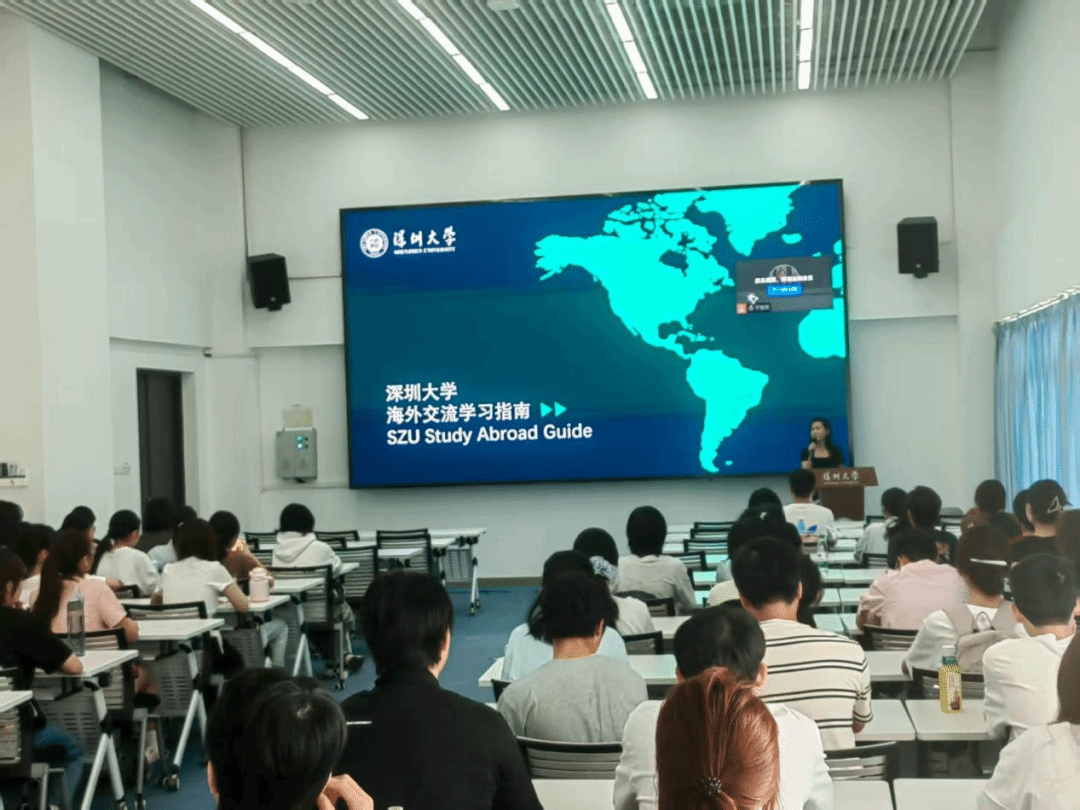 深圳大学国际交流部老师在报告厅为政府管理学院全体本研新生对学校国际化政策进行了介绍,在深圳大学海外交流学习指南中介绍了海外学习项目类型、学生可交流的国家(地区)与申请条件、学分转换与认证制度等信息。