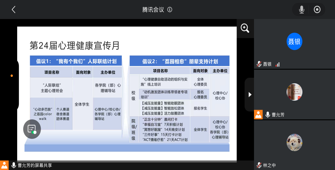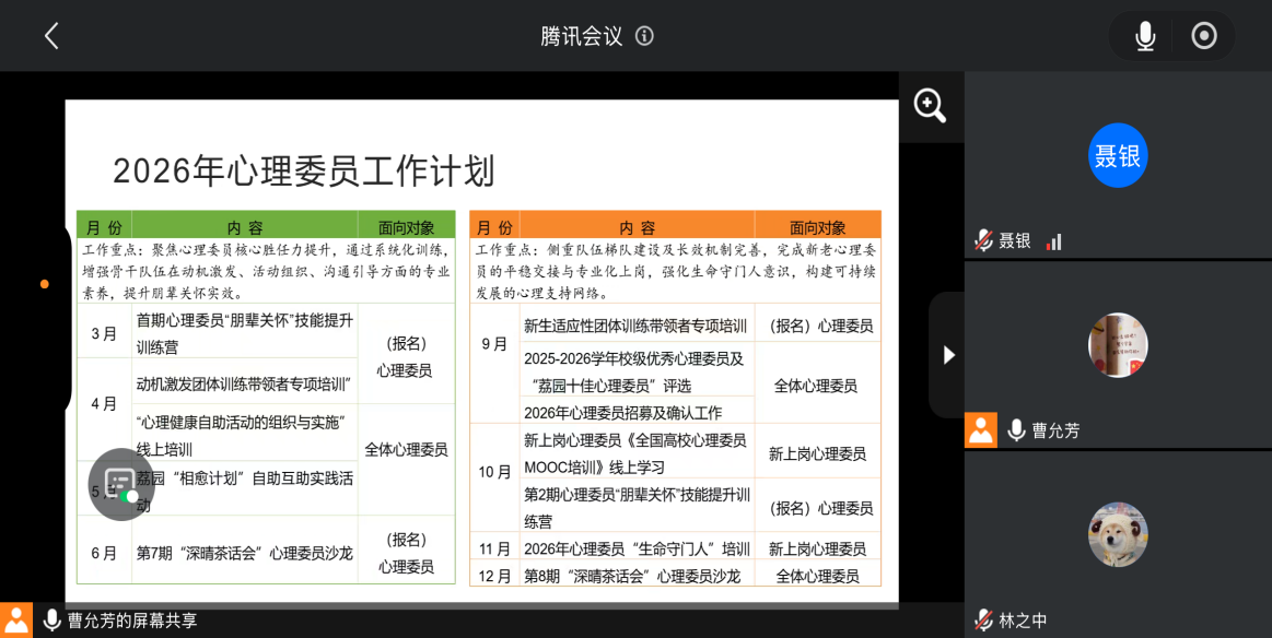 本次会议围绕心理委员工作职责与内容、第24届心理健康宣传月活动部署、2026年心理委员工作计划及工作考核要求等重点内容展开。
